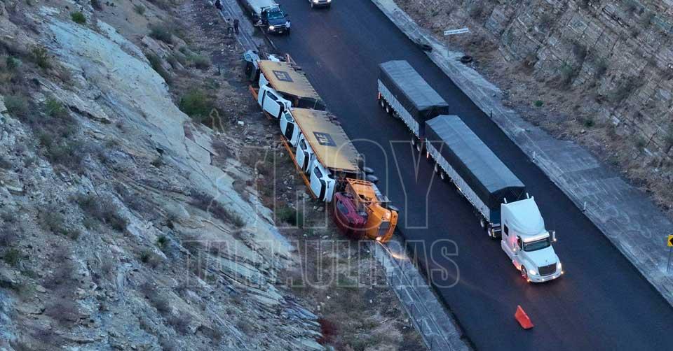 Ciudad Victoria, Tamaulipas.- Una nodriza que transportaba vehículos nuevos de la marca Chevrolet volcó la mañana de este miércoles a la altura del kilómetro 30 de la carretera Rumbo Nuevo; el conductor de la unidad resultó ileso, según los primeros reportes.