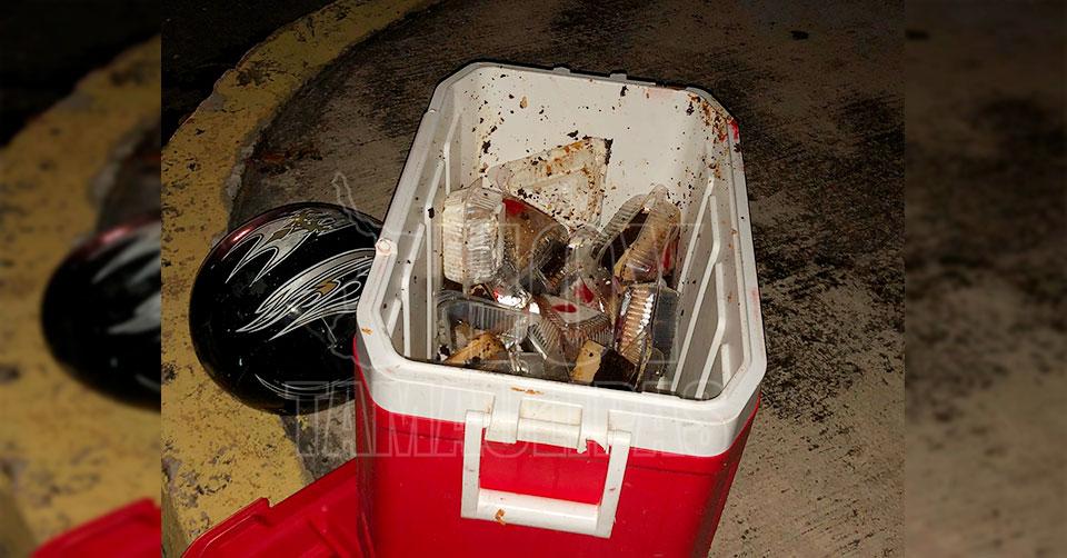 Pastelitos de diversas presentaciones y sabores quedaron regados sobre la vialidad, junto a una hielera color rojo en la que eran transportados.