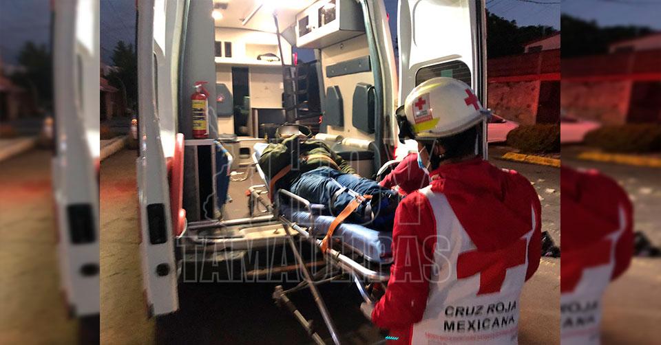 Paramédicos de la Cruz Roja acudieron al lugar para brindar atención al repartidor, quien fue trasladado al Hospital General al presentar una probable fractura en una de sus piernas.