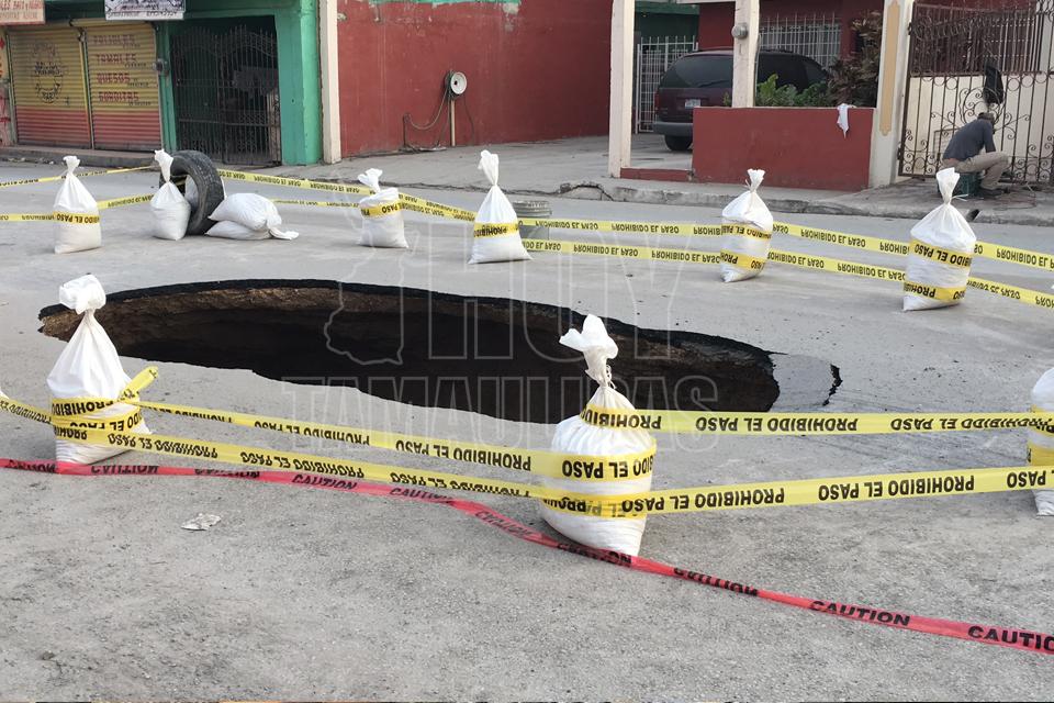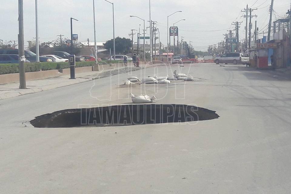 Reynosa, Tamaulipas.- Un profundo socavón se abrió este sábado en la Avenida Américo Villarreal Guerra, que divide a las colonias Lázaro Cárdenas y Antonio J. Bermúdez en Reynosa.