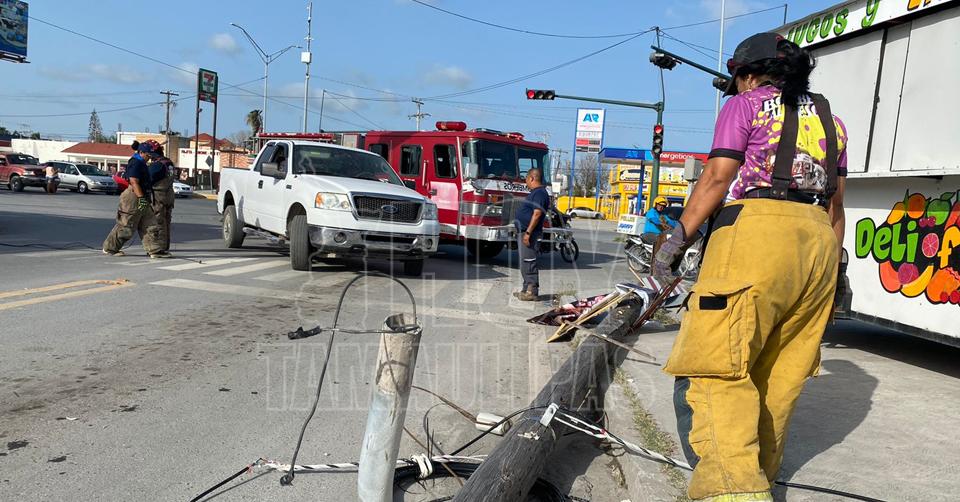 Matamoros, Tamaulipas. - El chofer de un camión de Quesos San Miguel del municipio de Matamoros tumbó un poste de Telmex y cayó sobre una camioneta.