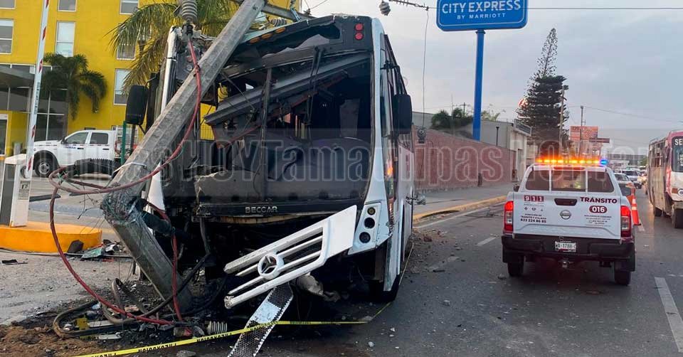 Autobús industrial choca contra poste y golpea automóvil en Altamira