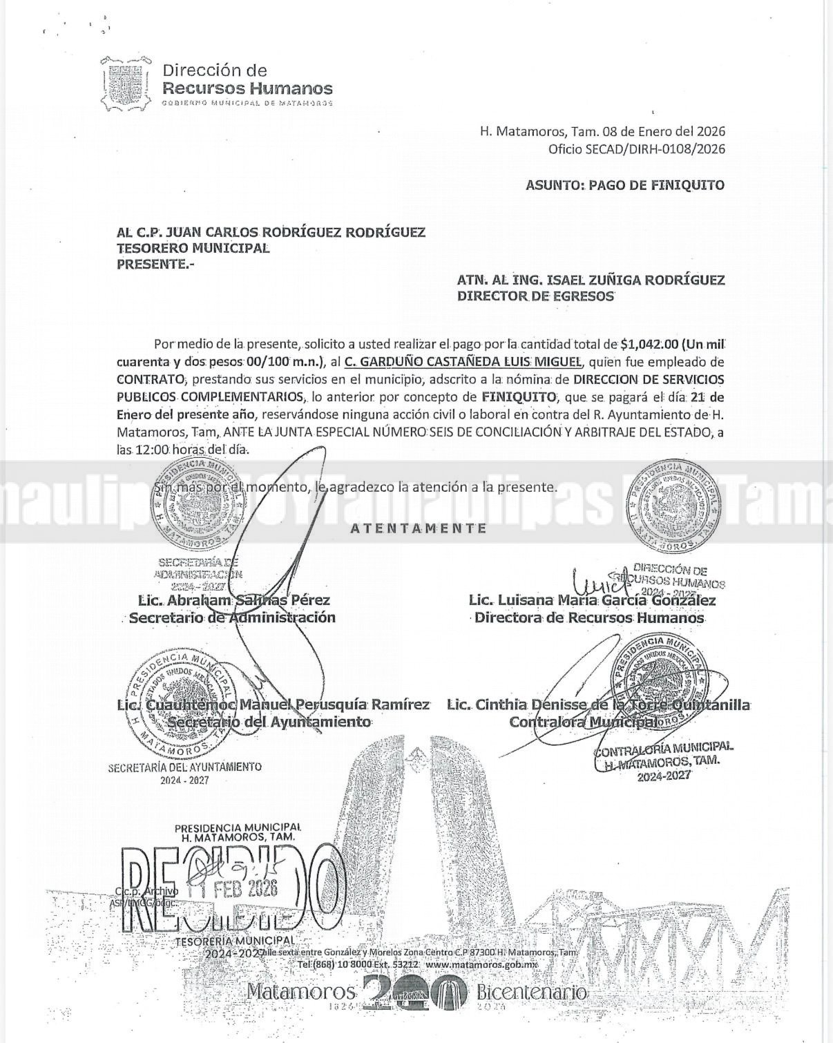 Matamoros, Tamaulipas.- El Gobierno Municipal de Matamoros desmintió cualquier vínculo laboral vigente con Luis Garduño Castañeda, detenido recientemente en Estados Unidos por presuntos delitos relacionados con narcotráfico.
