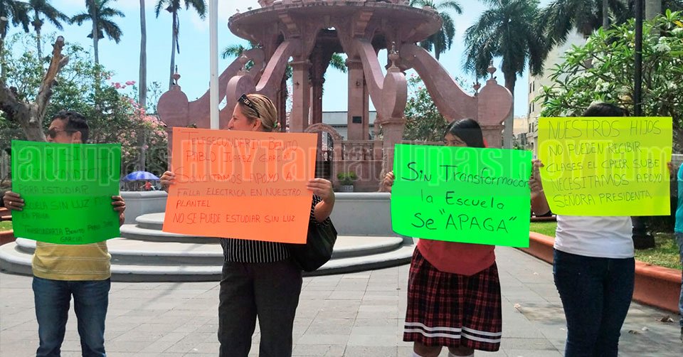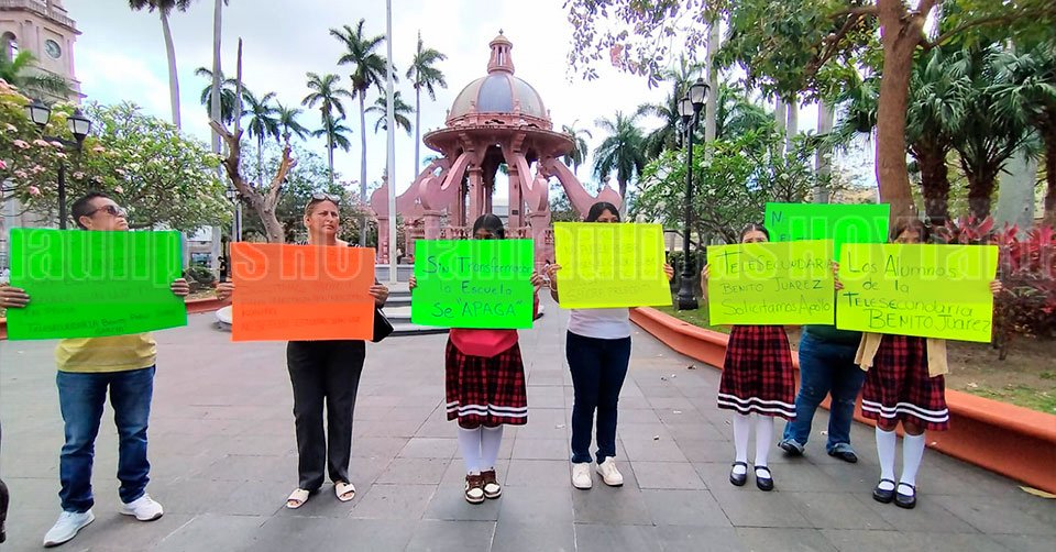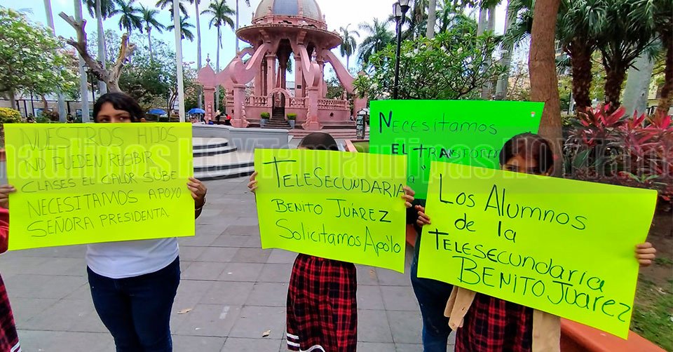 Tampico, Tamaulipas. - Madres de familia, alumnos y docentes de la Escuela Telesecundaria “Benito Juárez”, ubicada a un costado del Libramiento Poniente de Tampico, se manifestaron de forma pacífica frente al Palacio Municipal para exigir la restitución del servicio de energía eléctrica, del cual carecen desde hace dos años.