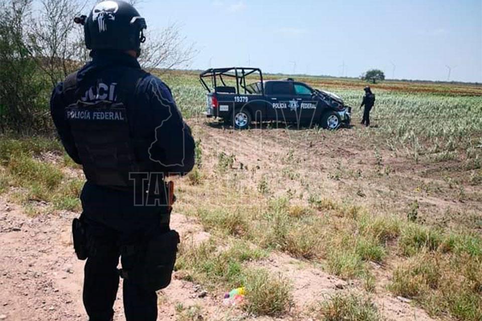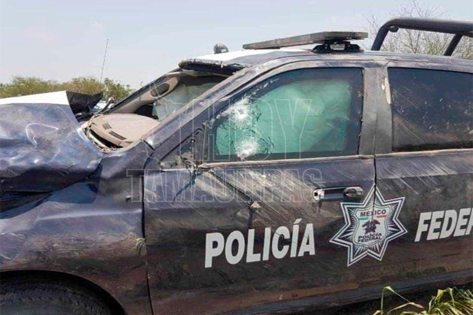 En gráficas que circulan a través de redes sociales se aprecia una camioneta de federales con impactos de arma de fuego y completamente dañada por la volcadura