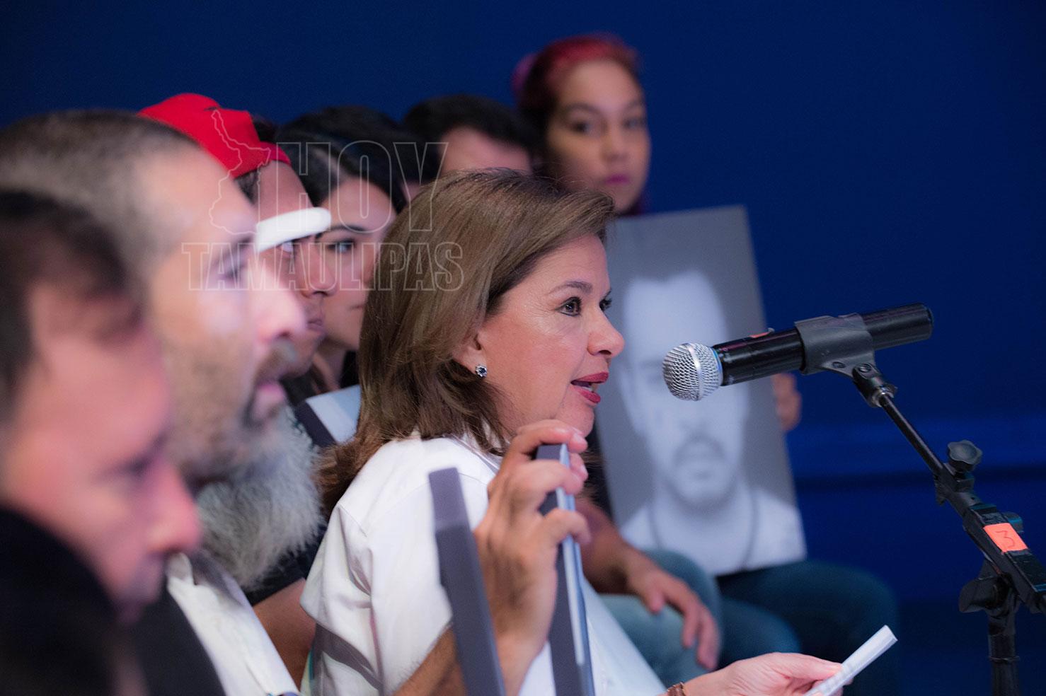La directora del ITCA, Sandra Luz García Guajardo hablando sobre la realización del Concurso Estatal de Teatro "Rafael Solana" y acompañada por actores