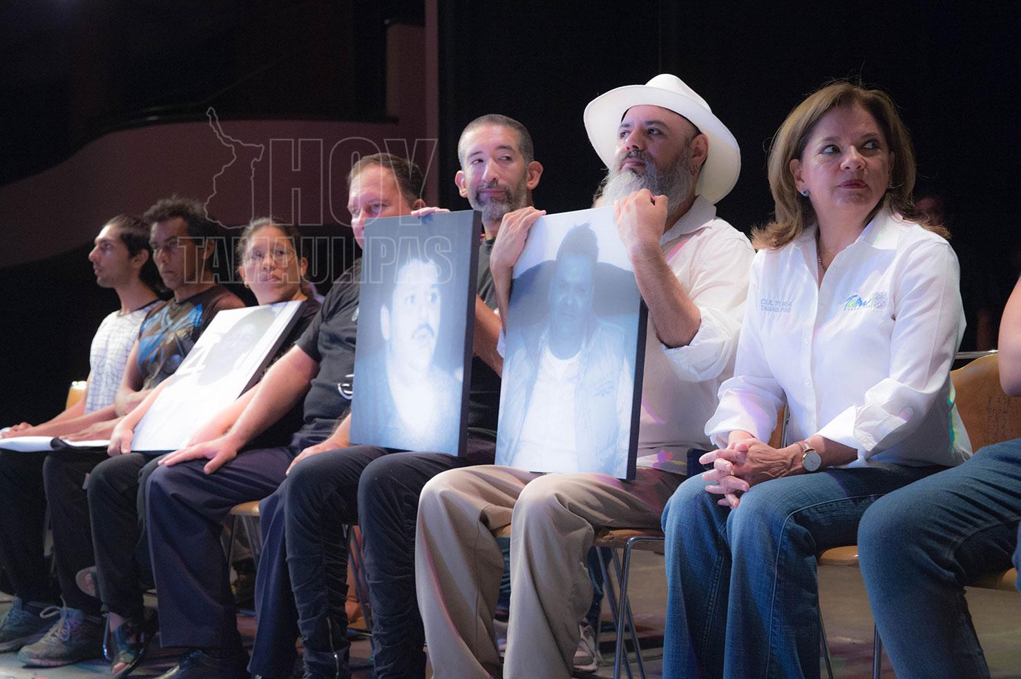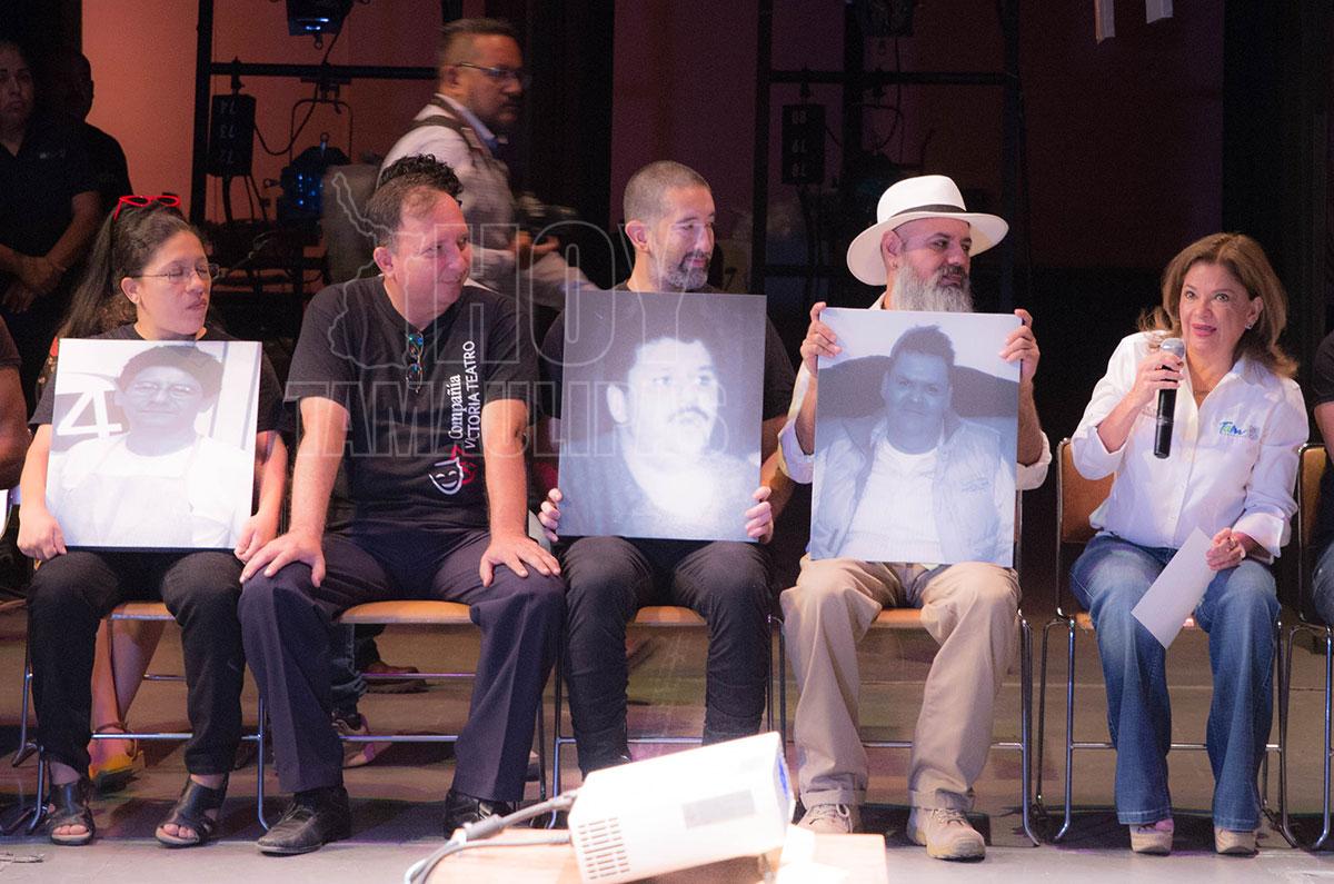 Un grupo de actores con fotografías de artistas tamaulilpecos fallecidos, durante la conferencia por la realización del Concurso Estatal de Teatro "Rafael Solana"