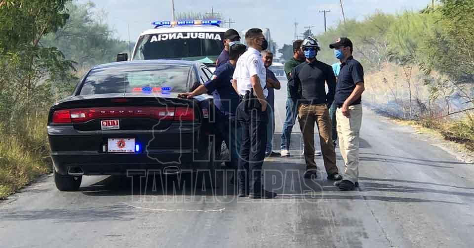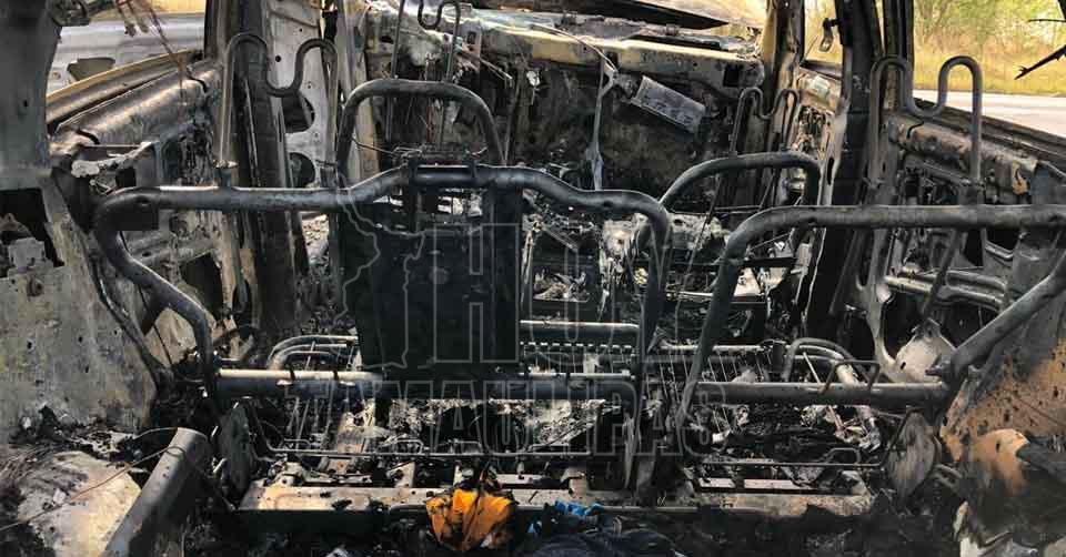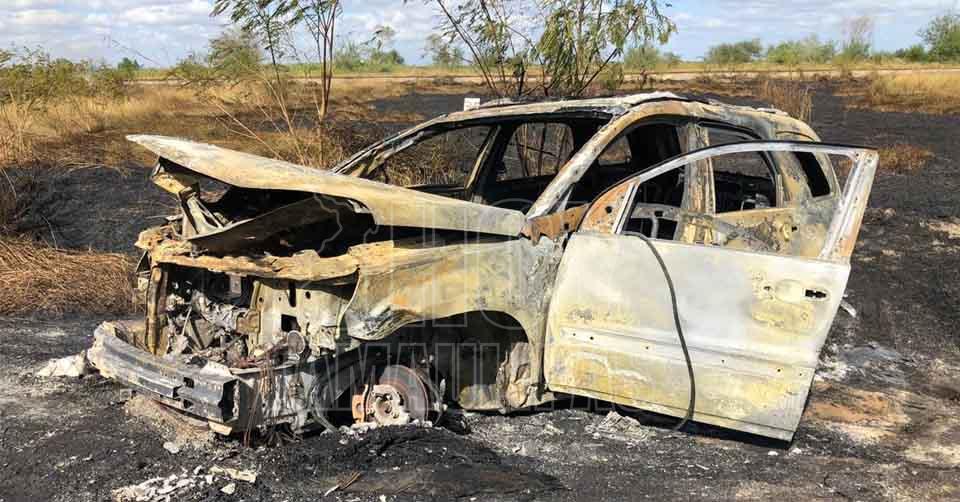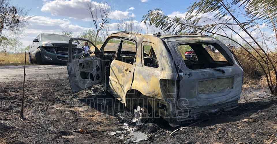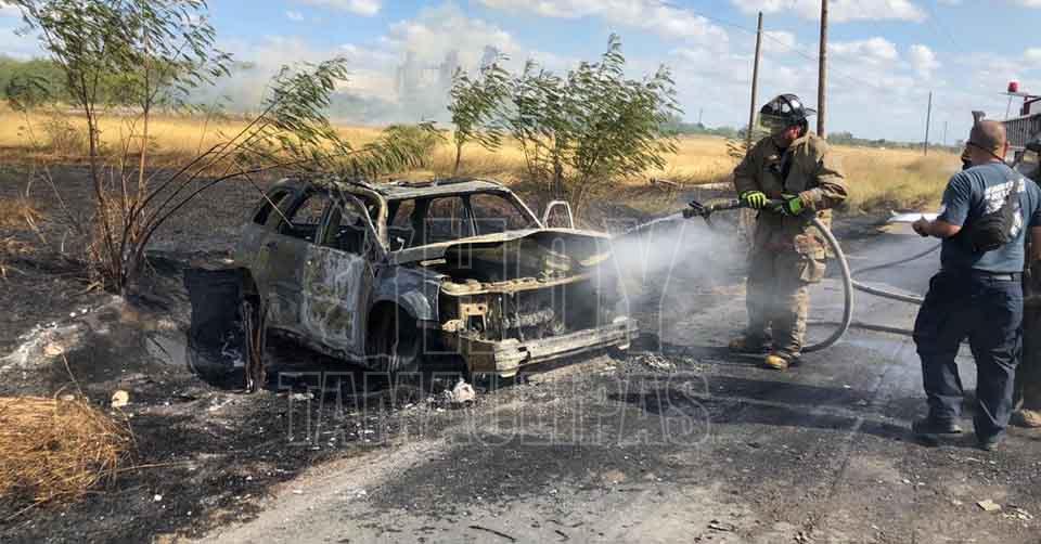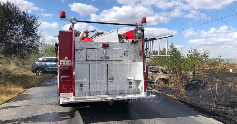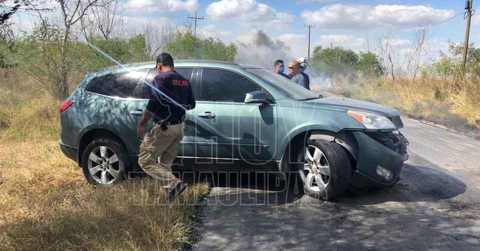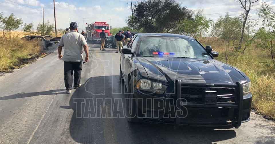 El percance se registró entre una Chevrolet Traverse y una Equinox en la brecha que conduce al Ejido Sandoval en Matamoros, quedando la última unidad prácticamente reducida a cenizas
