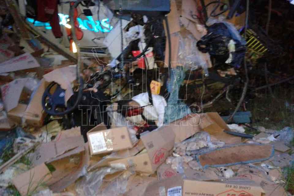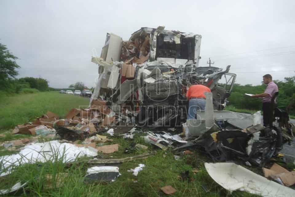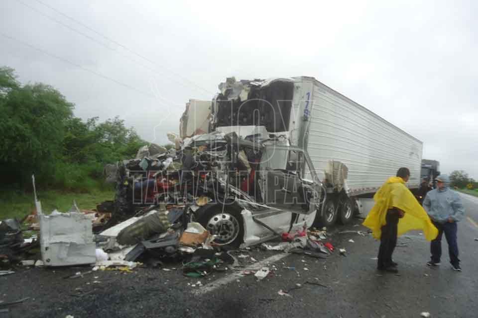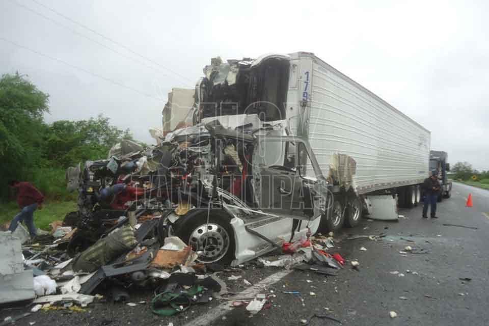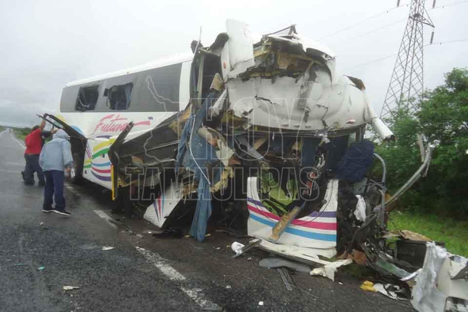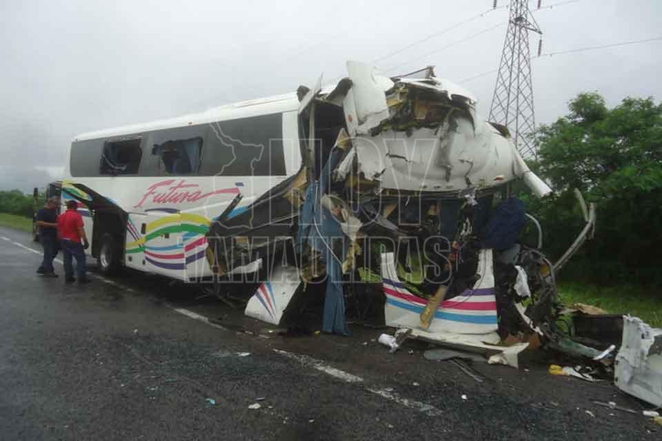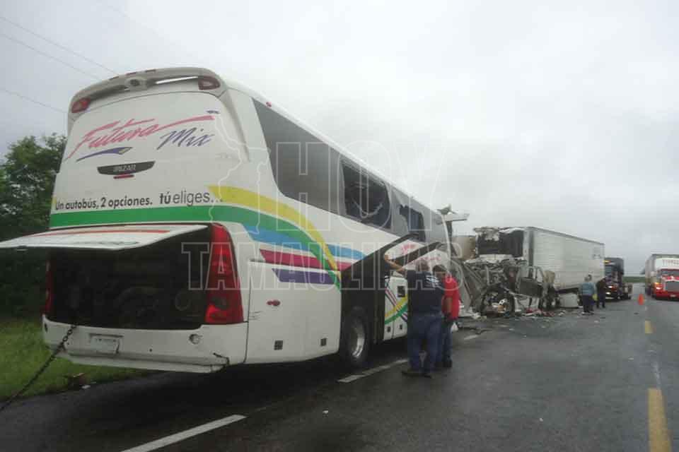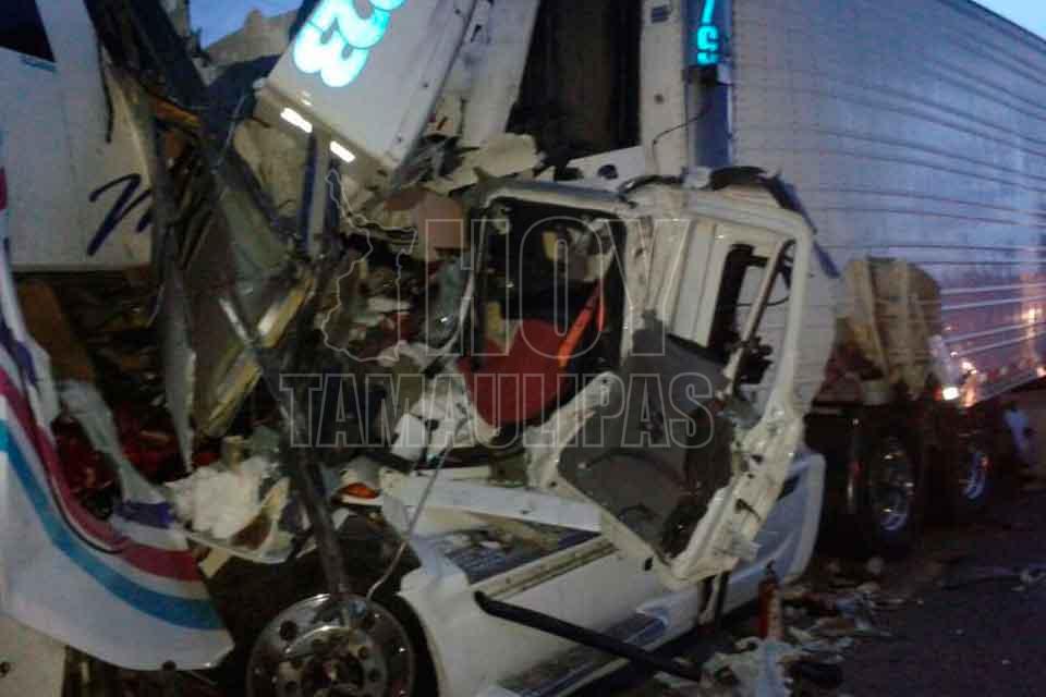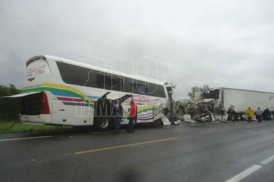 El chofer de un autobús de pasajeros y el de un tráiler murieron tras impactar las unidades que manejaban de frente, resultando cinco lesionados