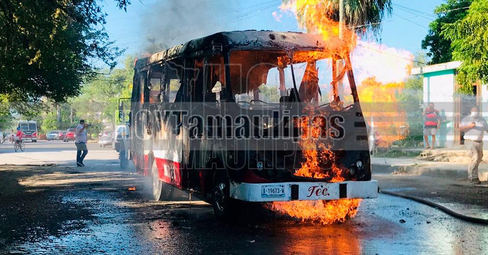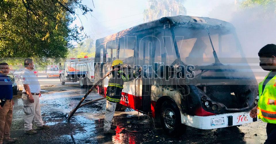 Personal de Protección Civil del Estado acudió al 30 Bravo para sofocar el incendio de un microbús de la Ruta 23, mismo que quedó prácticamente reducido a chatarra