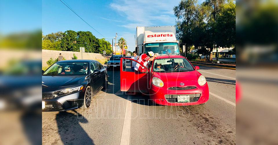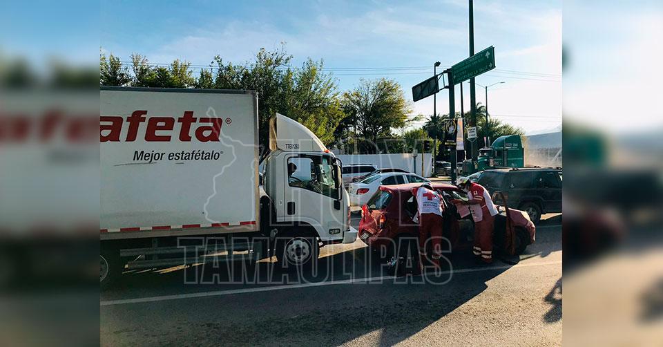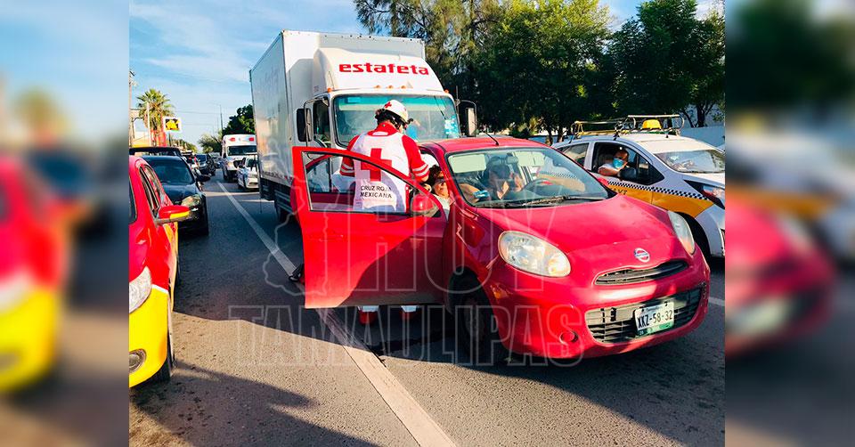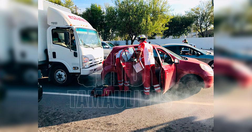 Un auto compacto fue chocado por alcance por el conductor de un camión de paquetería, por lo que paramédicos de la Cruz Roja acudieron a prestar auxilio