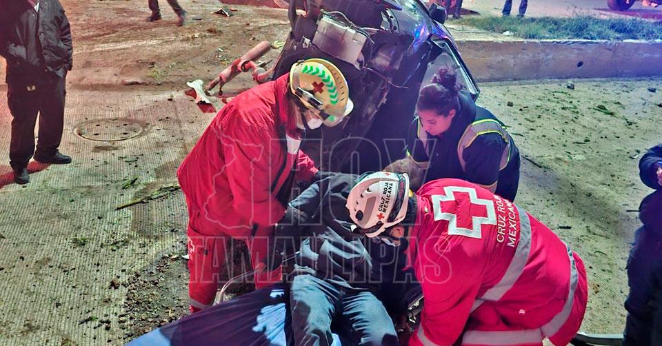 Paramédicos de la Cruz Roja auxiliando al conductor de la camioneta Nissan Rouge, quien casi se mata tras el accidente en la Calzada General Luis Caballero y Avenida Del Maestro en Victoria