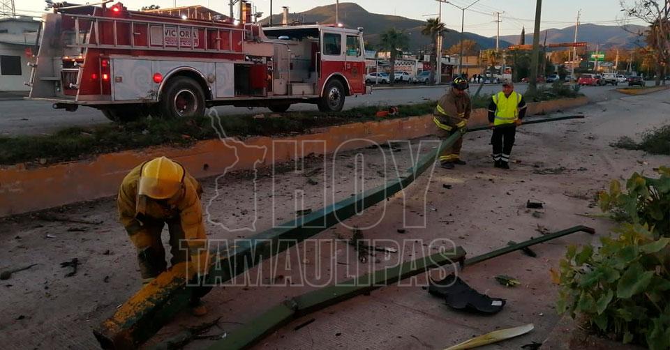 Personal de Bomberos moviendo las luminarias que fueron derribadas por el conductor de la camioneta Nissan Rouge que terminó prácticamente convertida en chatarra