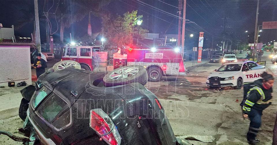 Personal de Bomberos rociando agua a la camioneta Nissan Rouge que terminó sobre uno de sus lados en la Calzada General Luis Caballero y Avenida Del Maestro en Victoria