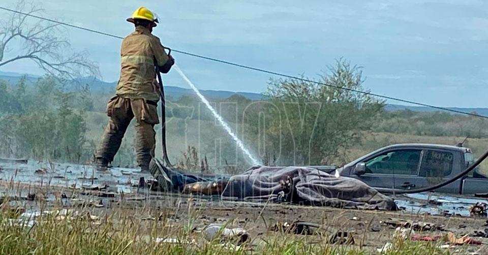 Un bombero logró apagar el fuego provocado por el choque, tras él, las unidades que quedaron casi reducidas a cenizas