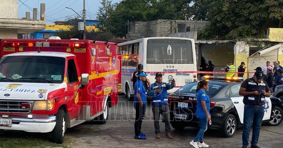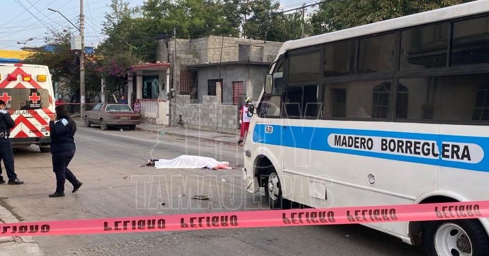 La unidad de transporte público con la que chocó el motociclista y a unos metros el cuerpo sin vida