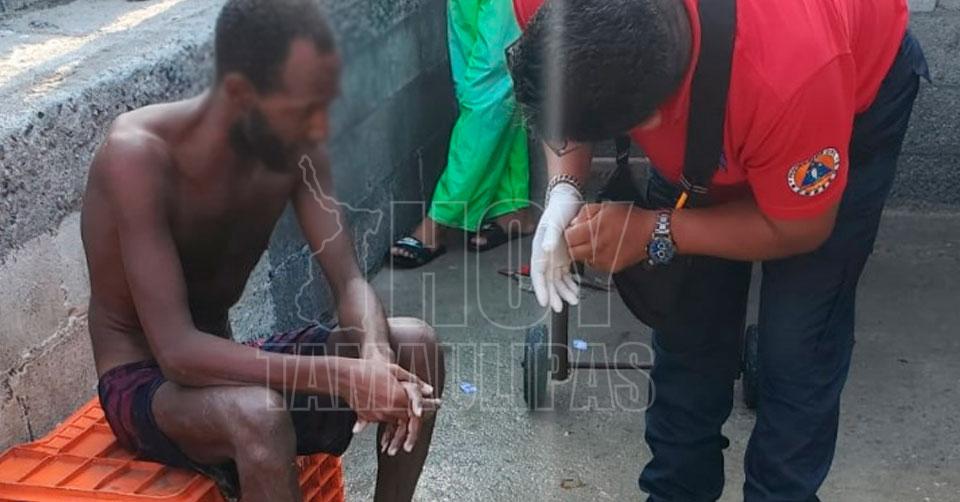 Náufrago cubano con una playera de rayas amarillas con negro y ropa interior sentado sobre una caja de plástico siendo atendido por un paramédico de Protección Civil de San Fernando