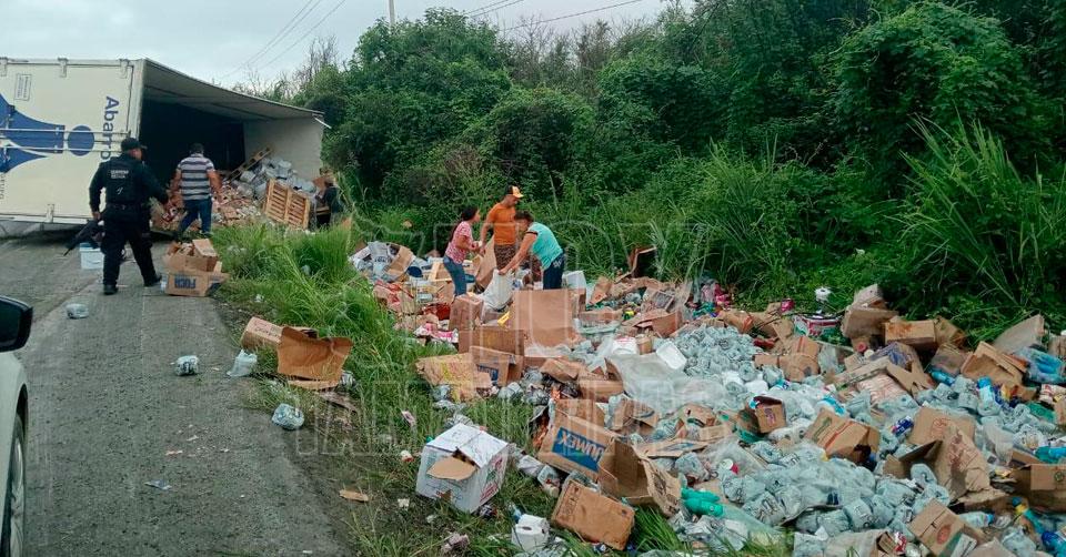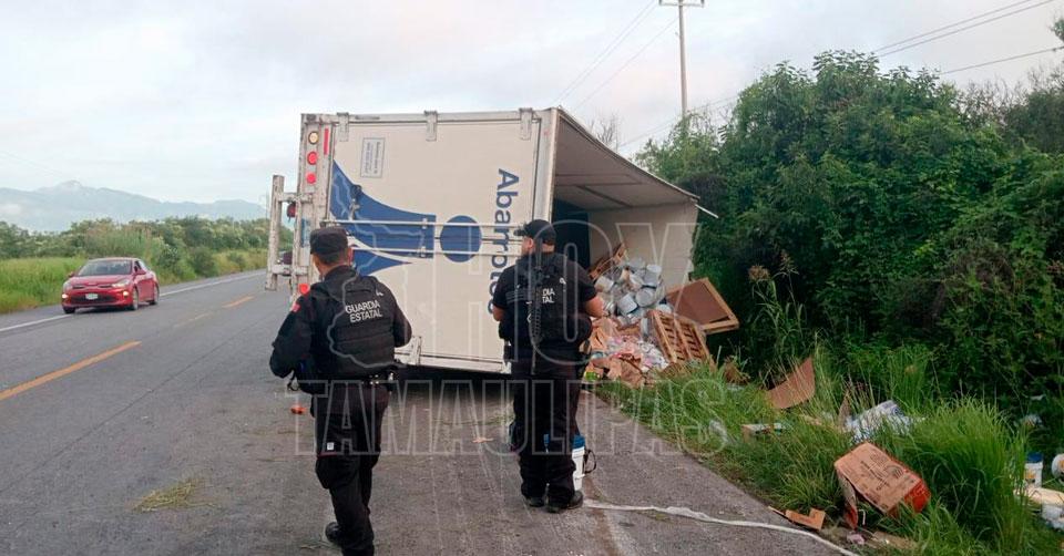 Elementos de la Guardia Estatal custodian un camión de abarrotes que se encuentra volcado en la carretera