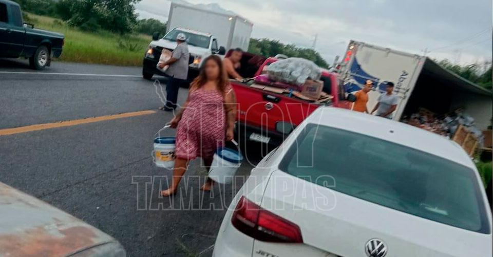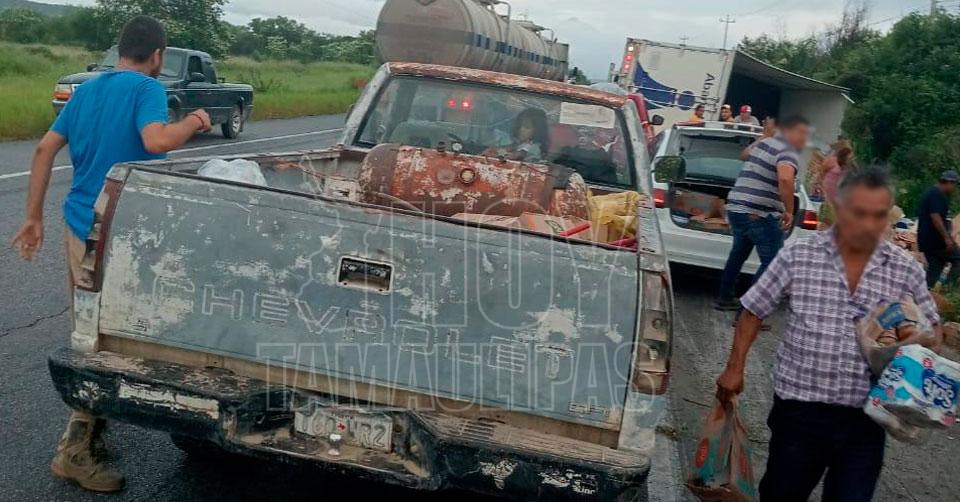 Ciudadanos cargan una camioneta con los productos sustraídos de la unidad