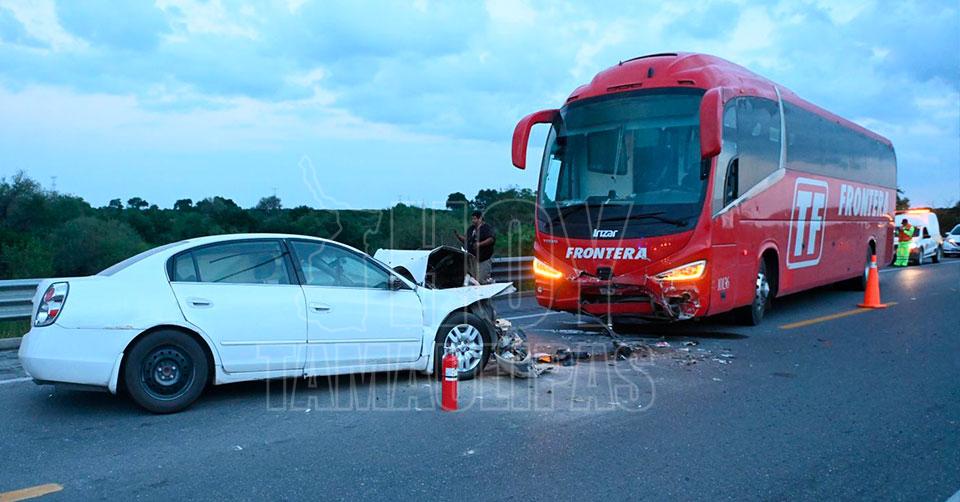 El autobús de pasajeros de la línea Frontera y el automóvil Nissan Altima blanco con placas de circulación SLS-680-B del Estado de Nuevo León