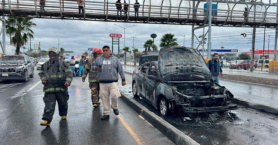 Personal del Cuerpo de Bomberos en el lugar donde se incendio un carro en Reynosa