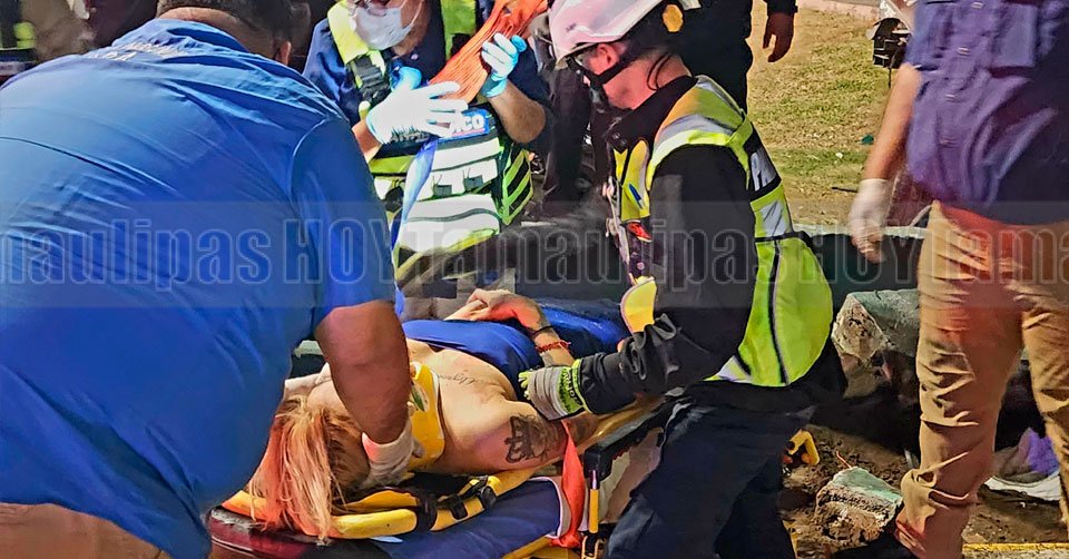 Paramédicos de las ambulancias Cora trasladan en camilla a una joven lesionada luego de chocar en Matamoros