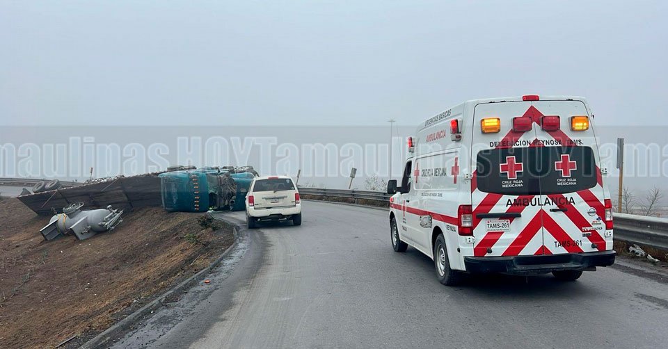 Tractocamión volcado en el caracol del periférico en Reynosa