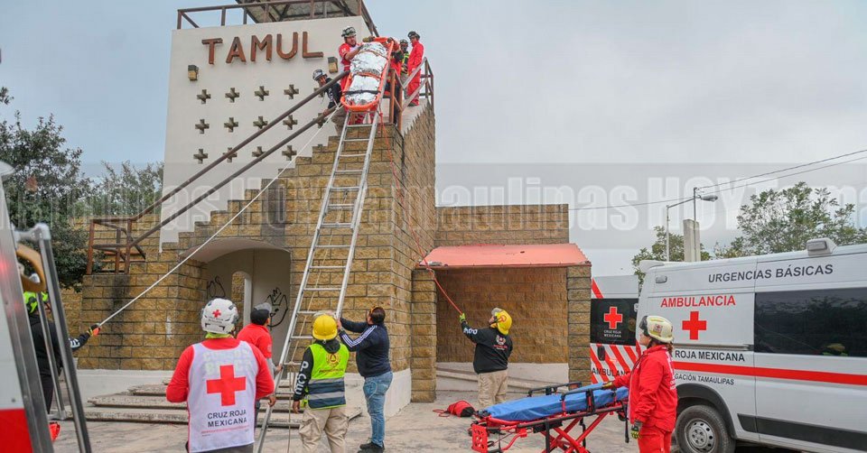 Paramédicos bajando en camilla rígida a la mujer agredida en Ciudad Victoria