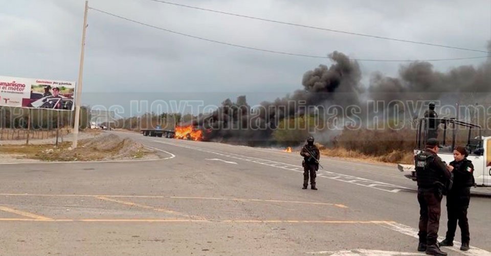 Guardia Estatal cerca del camión en llamas sobre la carretera Victoria-Monterrey