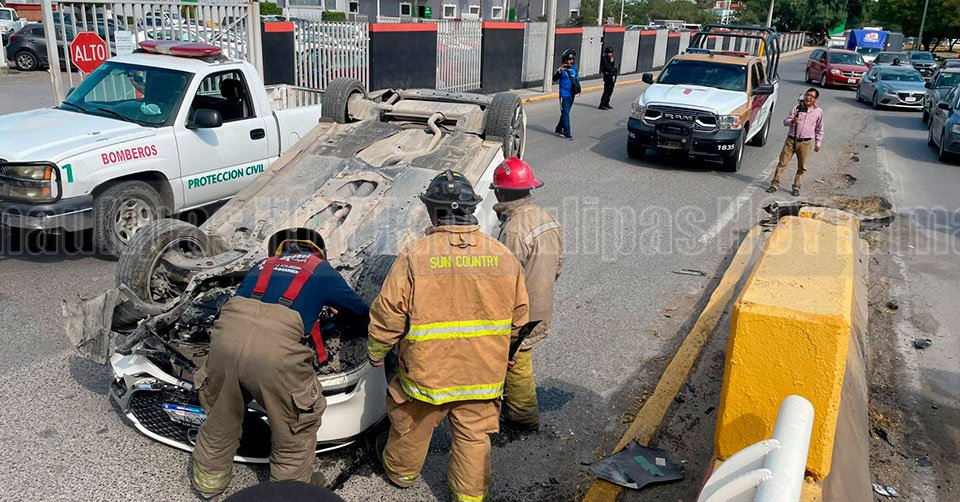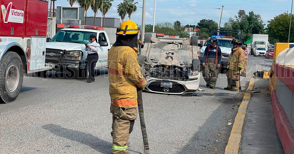 Elemento del Cuerpo de Bomberos cerca del automóvil volcado en Ciudad Victoria