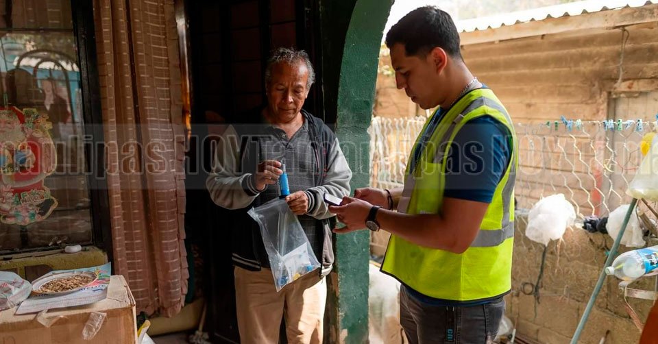 Integrante del "Ministerio de la Cubeta” explicando a una persona los beneficios del filtro de agua Sawyer en Ciudad Victoria