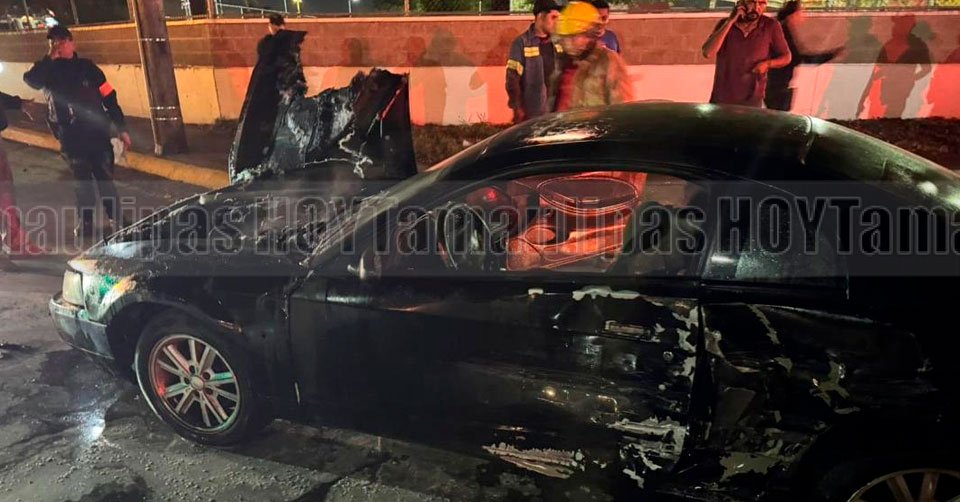 Momento en el que el carro Ford Mustang era apagado por bomberos luego de incendiarse en Ciudad Victoria