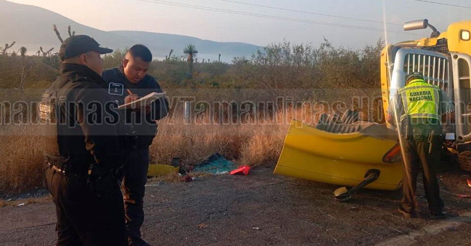 Elementos de la Guardia Estatal observando un tractocamion luego de chocar en la Tula-San Luis Potosí