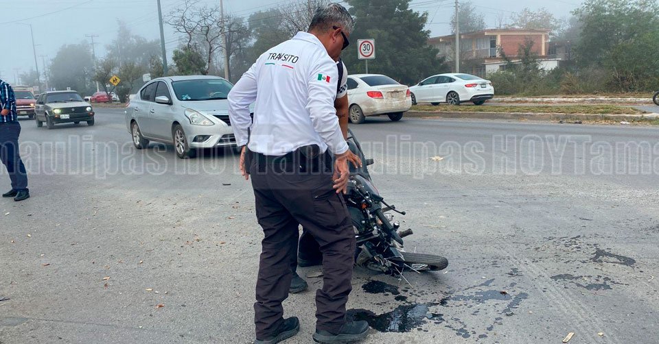Agente de Tránsito observando una motocicleta luego de que a su tripulante lo chocaran en Ciudad Victoria