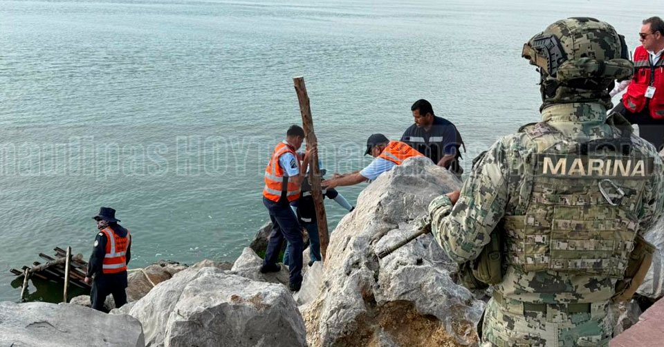 Personal de la Capitanía de Puerto, la Asipona, Marina Armada de México y Protección Civil retirando un muelle ilegal en las escolleras de Playa Miramar