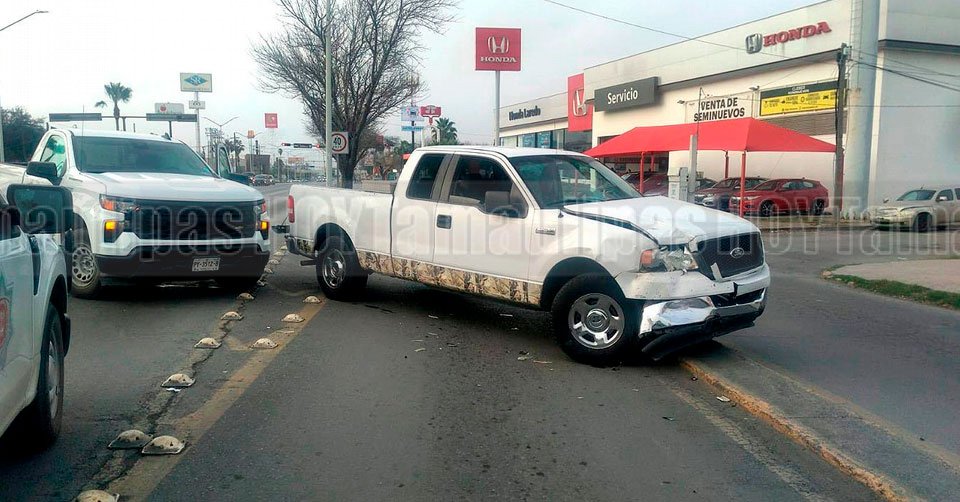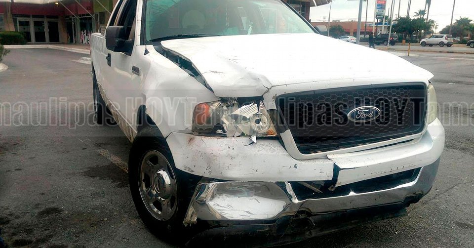 Camioneta Ford F150 con daños en la parte frontal luego de chocar en Nuevo Laredo