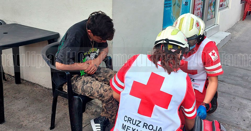 Ladrón sentado en una silla recibe atención por parte de paramédicos de la Cruz Roja en Tampico