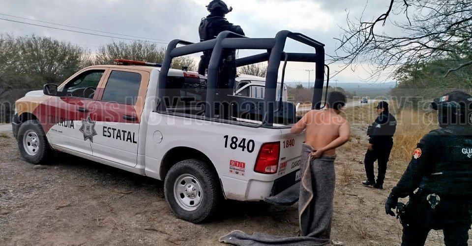 Personal de la Guardia Estatal junto con el hombre que fue localizado desnudo en la carretera Victoria-Llera; se le dio una cobija para que se cubriera