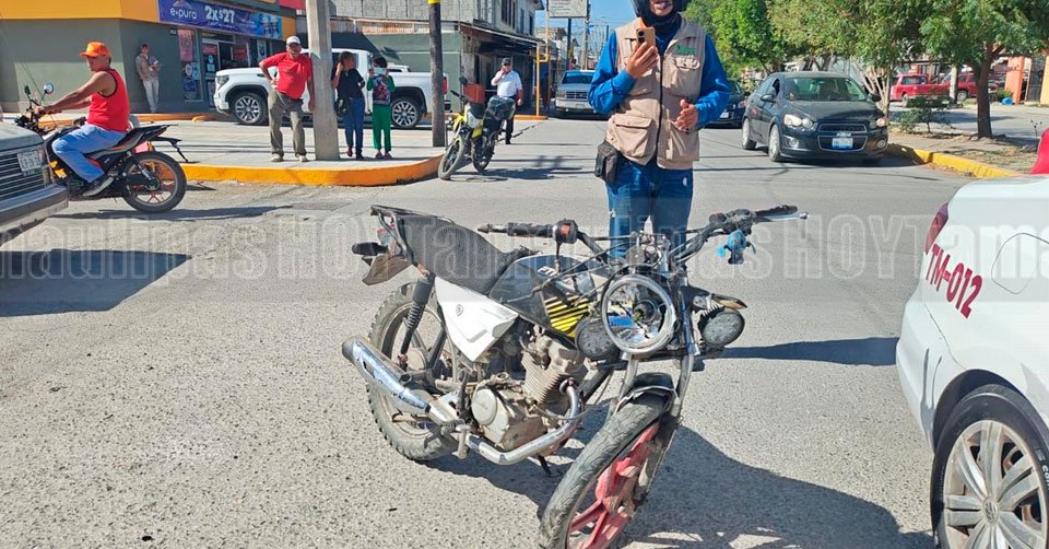 Moto con daños en una de sus llantas luego de ser chocada en Ciudad Victoria
