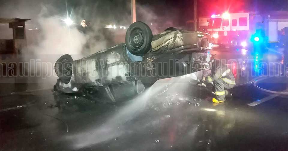 Automóvil que volcó e inmediatamente se incendió en Nuevo Laredo