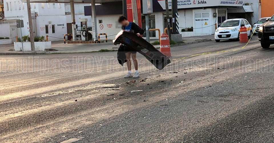 Joven recogiendo las partes de su automóvil luego de chocar en Tampico