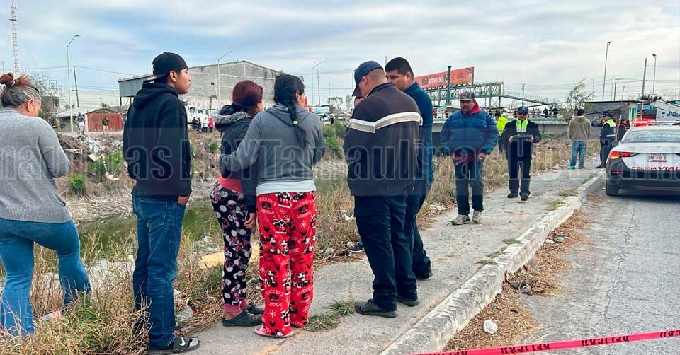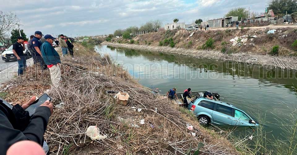 Personas observando la camionetaChrysler Town Country que cayó en el canal Guillermo Rodhe en Reynosa