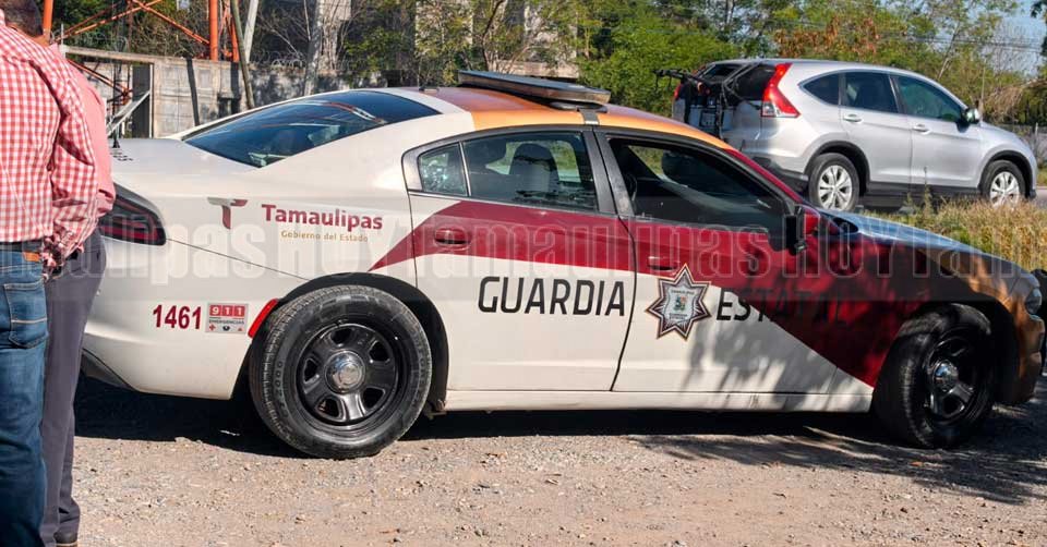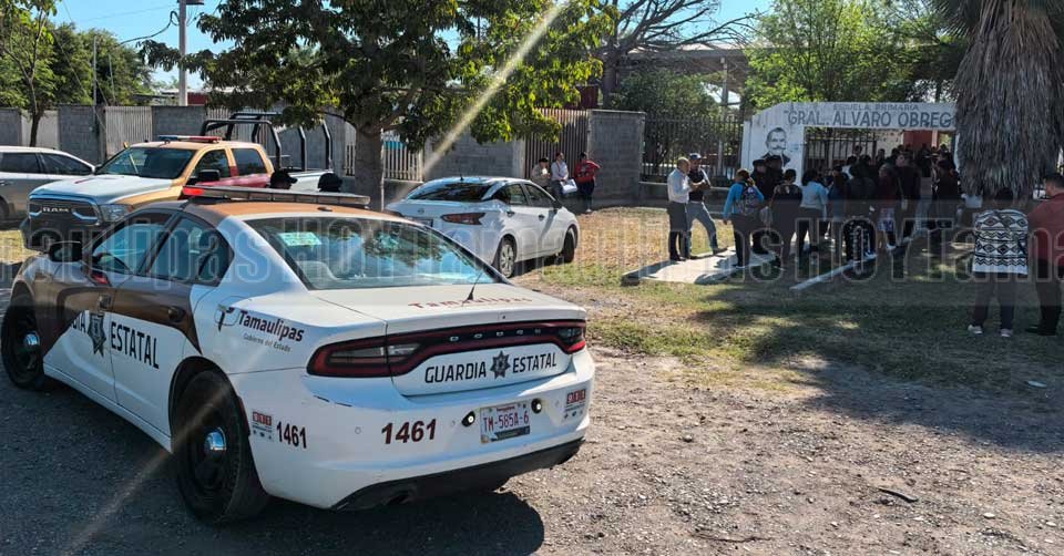 Patrulla de la Guardia Estatal al exterior de la Escuela Primaria 'General Álvaro Obregón' en el Ejido El Olivo en Ciudad Victoria donde madres de familia protestaban