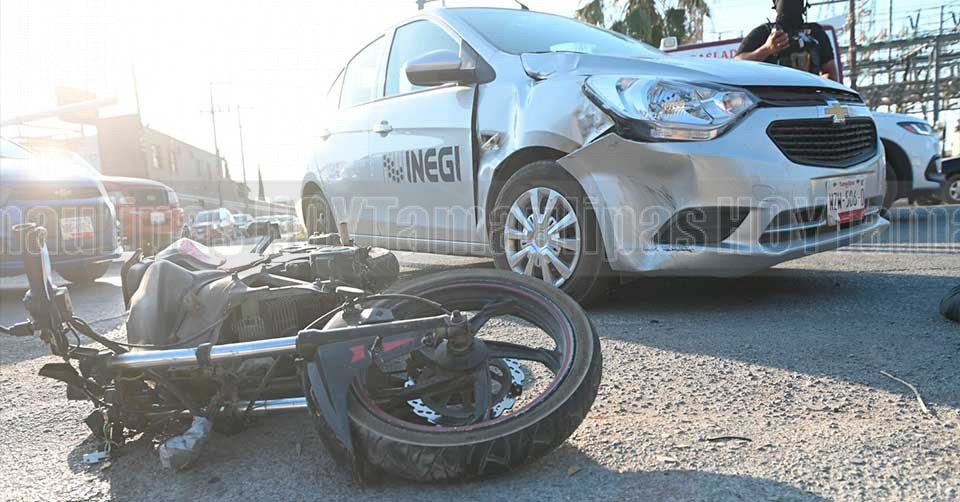 Auto del INEGI y la motocicleta que participaron en un accidente que dejó 2 lesionados en Ciudad Victoria