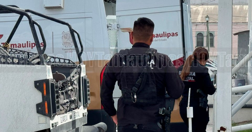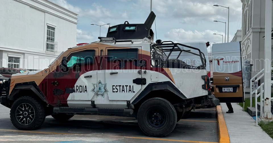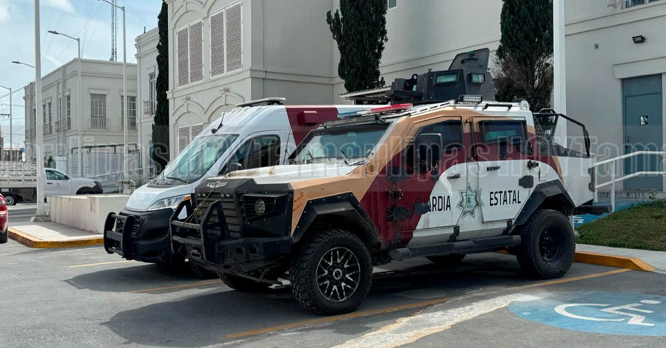 Unidades de la Guardia Estatal en el exterior de la agencia de la Fiscalía General de Justicia donde Eduardo "N" fue vinculado a proceso por el delito de feminicidio en Matamoros