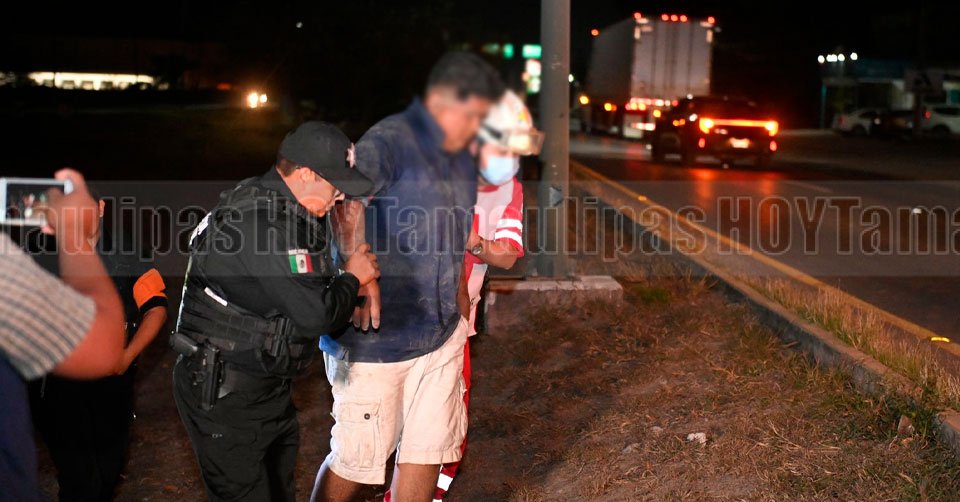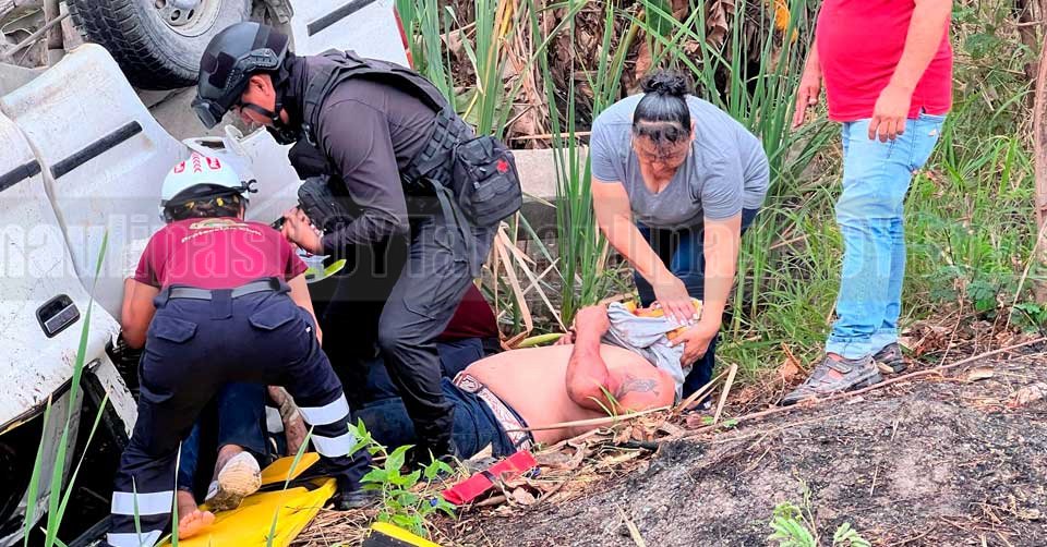 Momento en el que uno de los lesionados es auxiliado por un paramédico y un agente tras volcar la camioneta GMC en el Libramiento Naciones Unidas en Ciudad Victoria