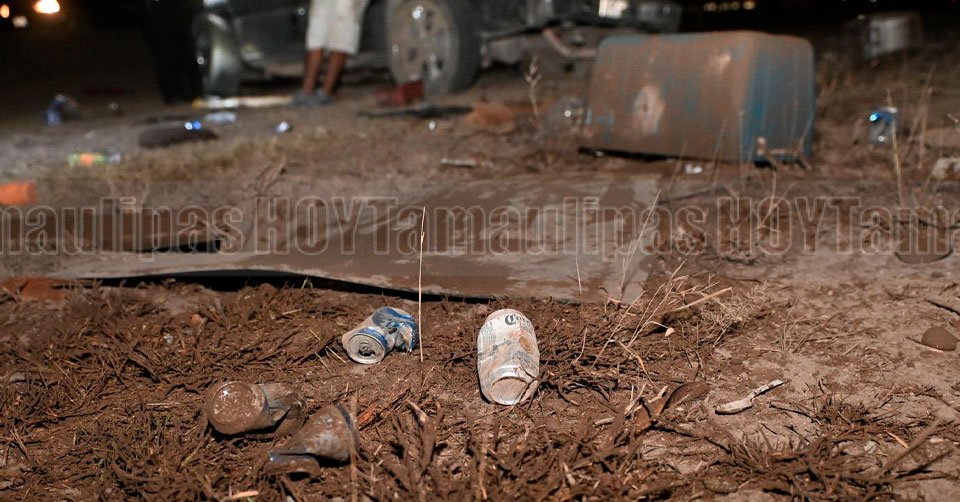 Latas de cerveza regadas cerca de donde terminó la camioneta GMC tras volcar en el Libramiento Naciones Unidas en Ciudad Victoria, antes de llegar a la Fiscalía