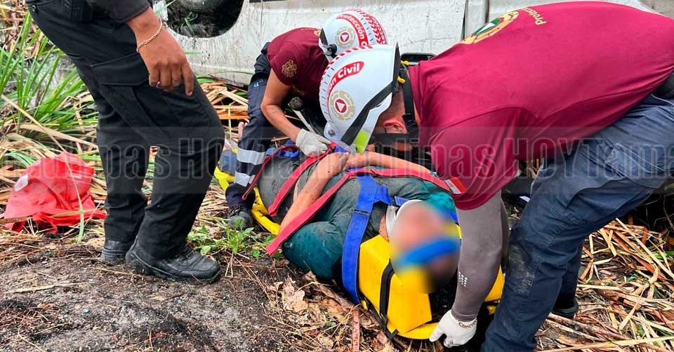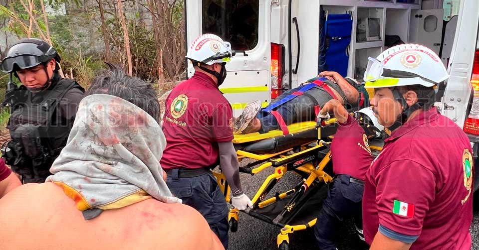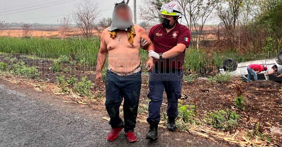 Momento en el que los lesionados son atendidos por paramédicos tras la volcadura de su camioneta sobre la carretera Mante- Tampico, a la altura del conocido y famoso platillo volador