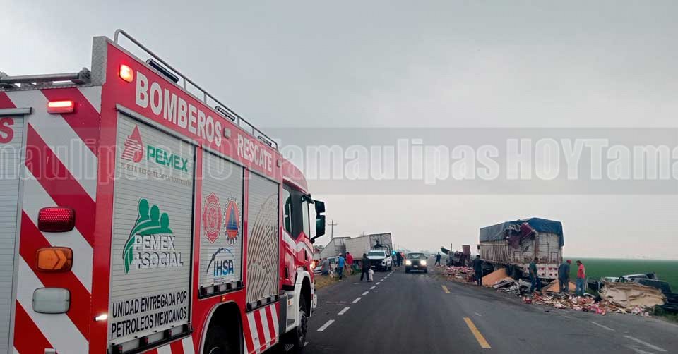 Unidad de Bomberos en el sitio donde dos tráileres participaron en un encontronazo en la carretera Victoria-Matamoros, antes de llegar al entronque de González Villarreal en San Fernando.