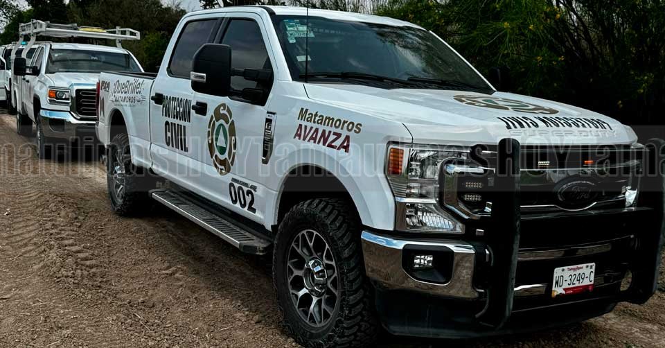 Unidad de la Dirección Municipal de Protección Civil en el sitio donde fue localizado el cuerpo sin vida de un hombre en el río Bravo en Matamoros
